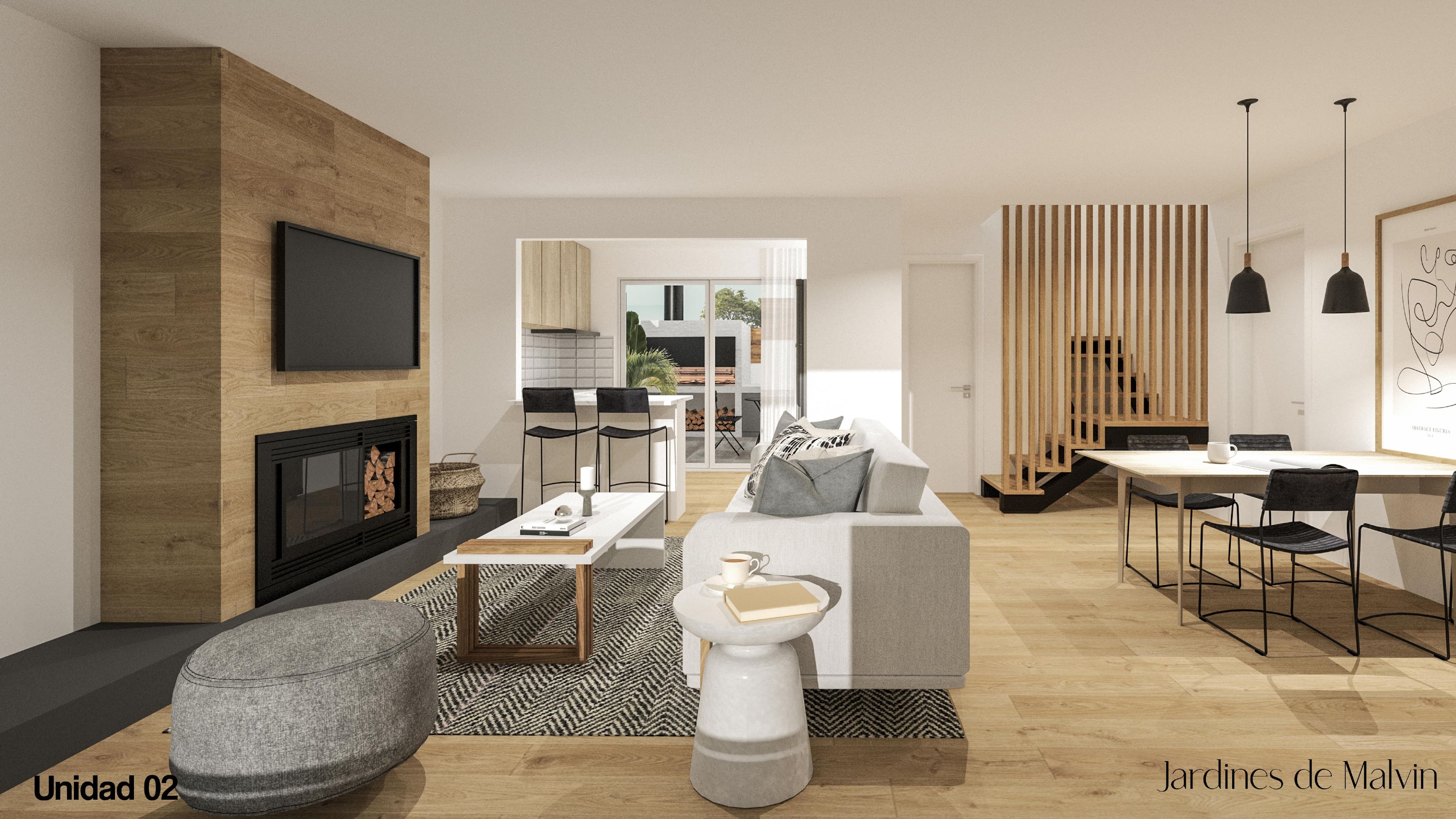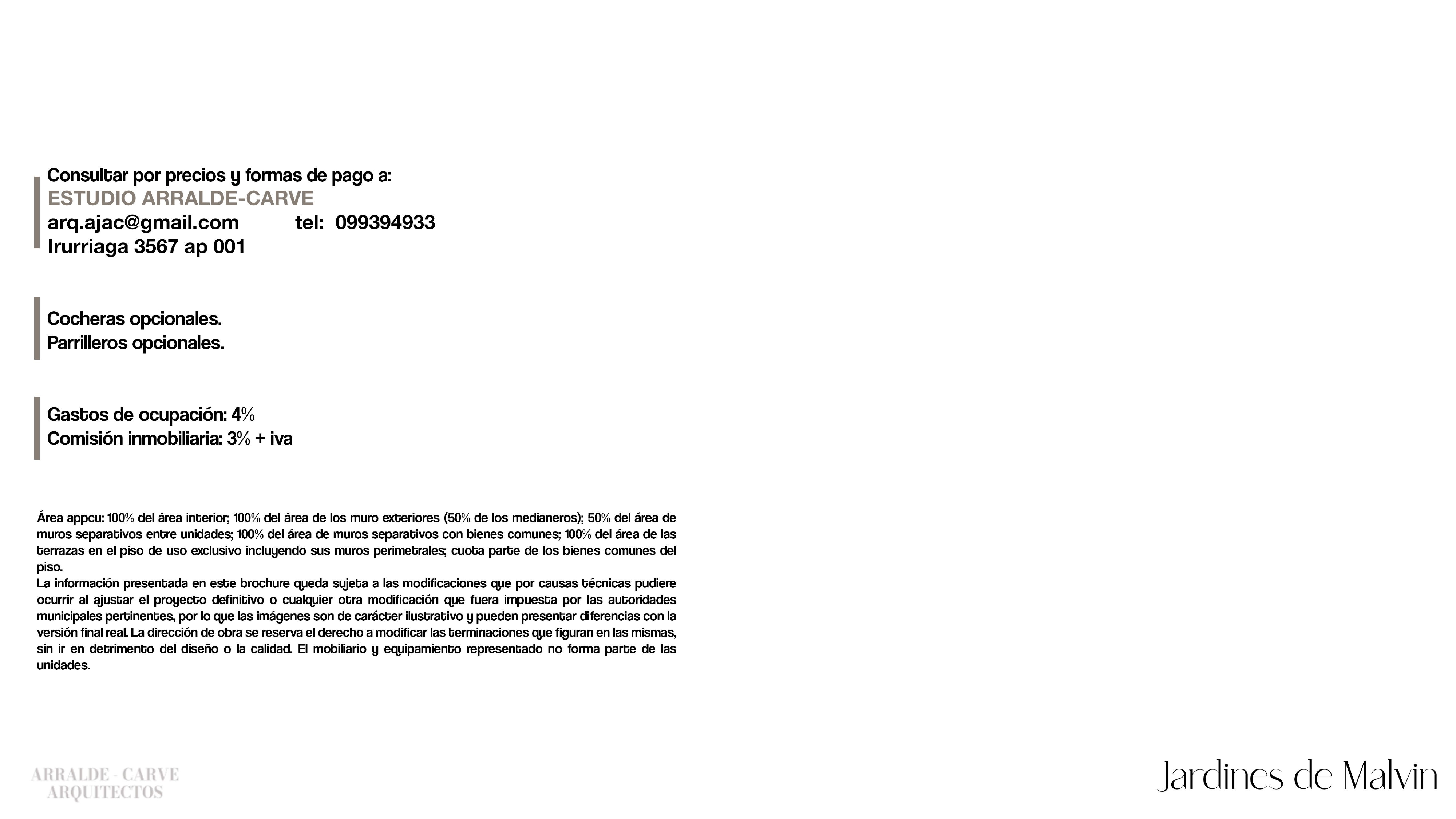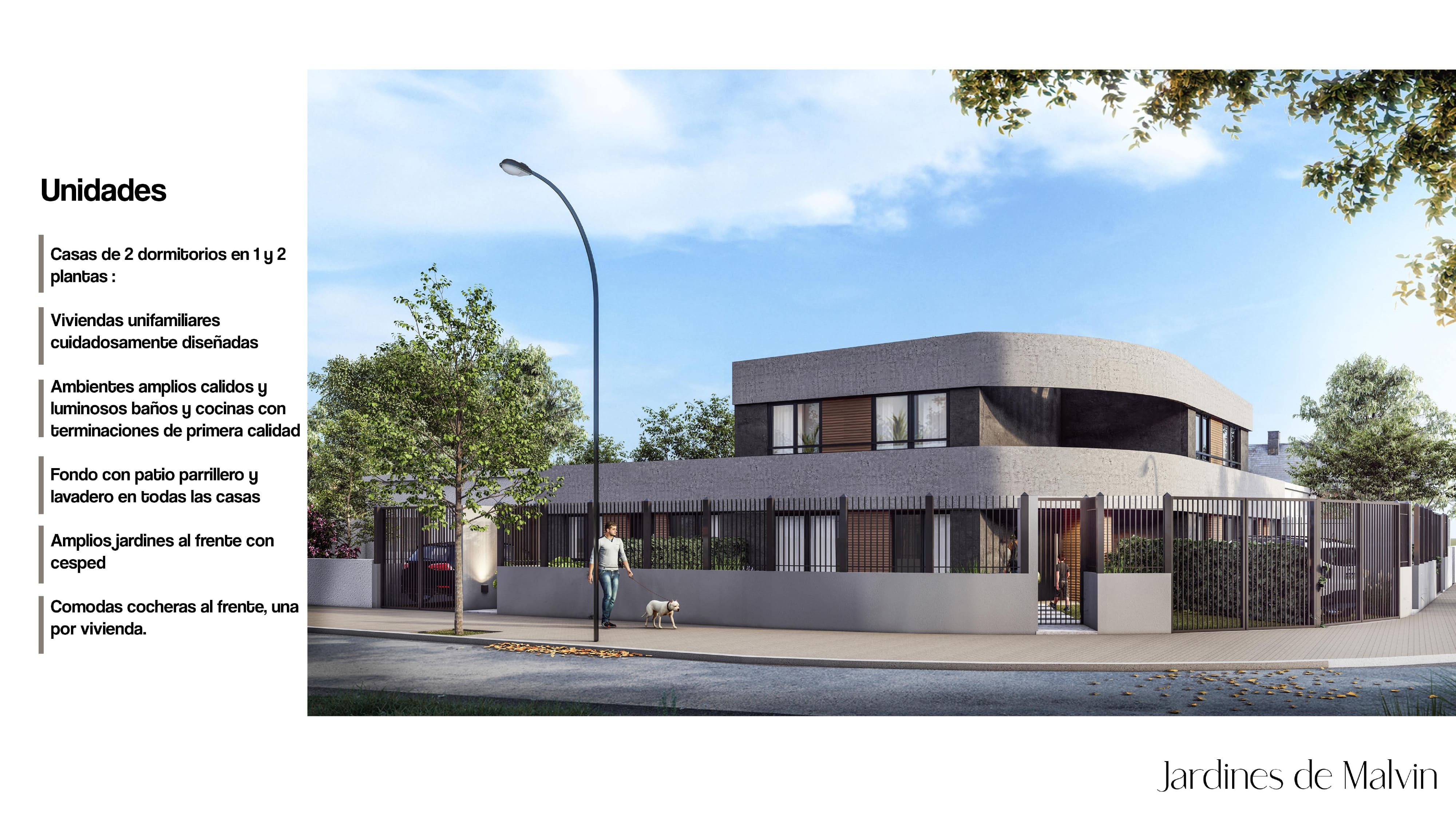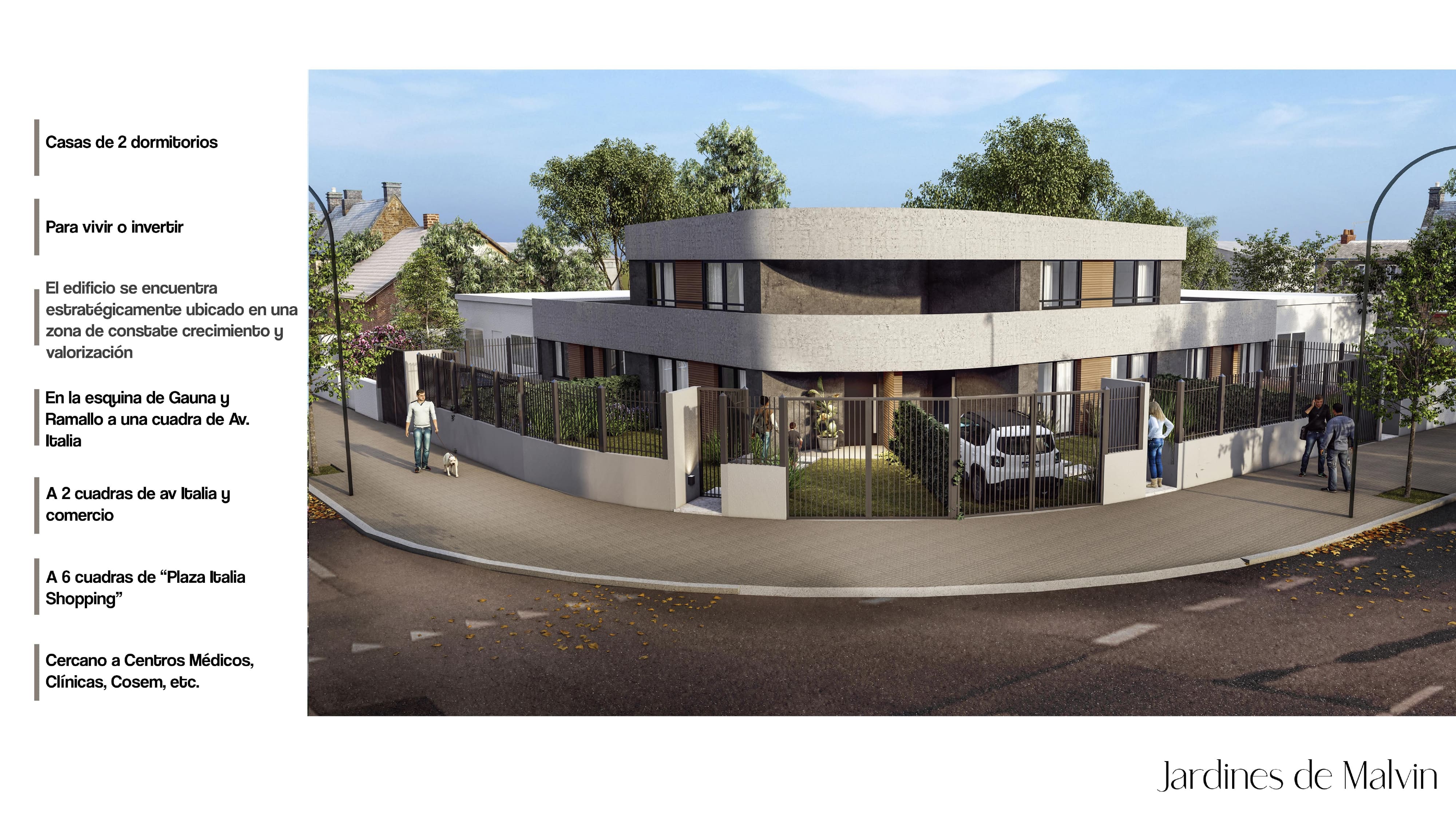 Jardines de Malvin es un complejo de viviendas en etapa de construcción Son 4 casas de dos dormitorios cada una, dos duplex y dos simples . Funcionan independientes y por tanto no tienen gastos comunes , con frente a la calle cochera y jardín verde exclusivo y fondo con parrillero exclusivo