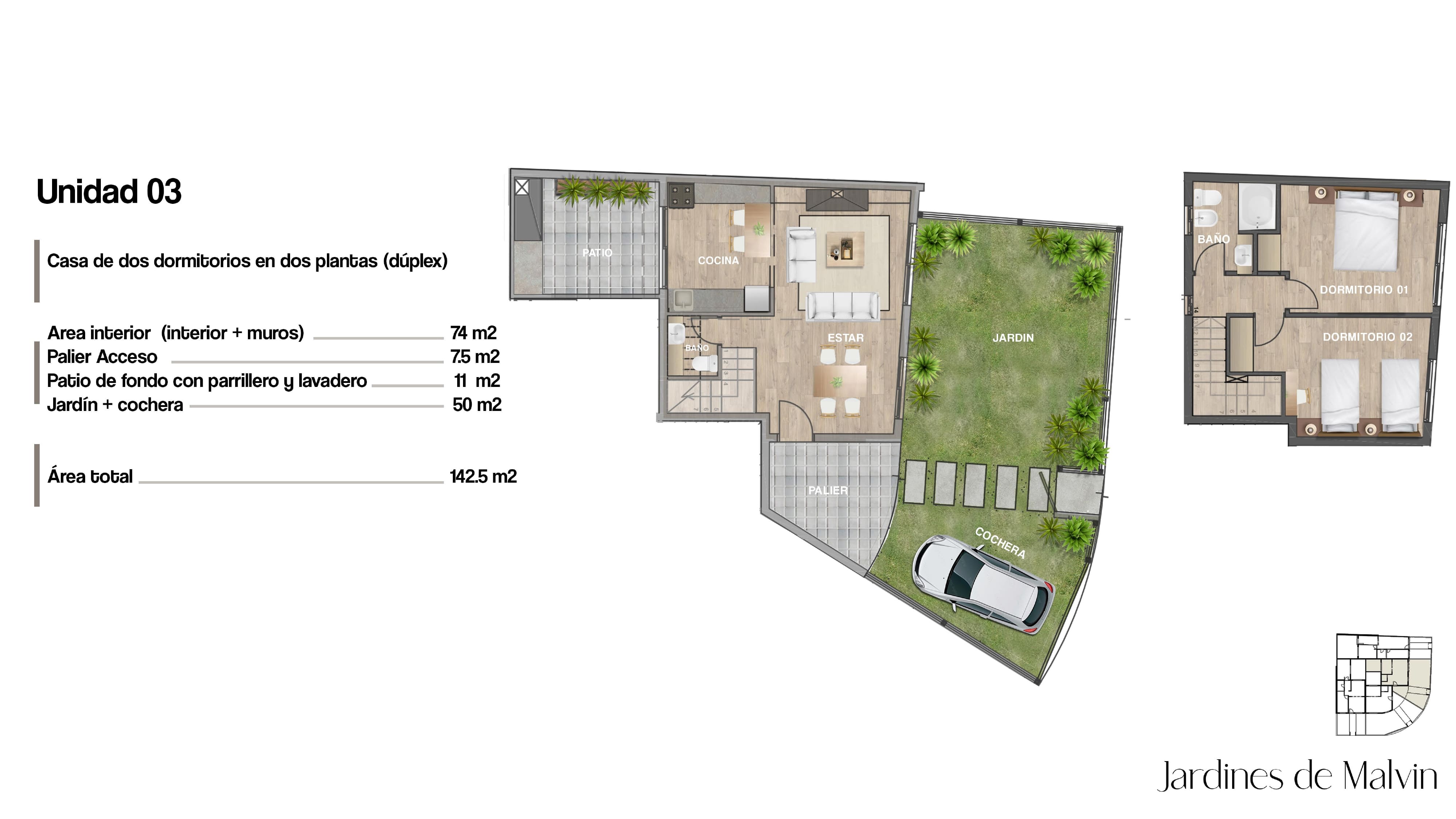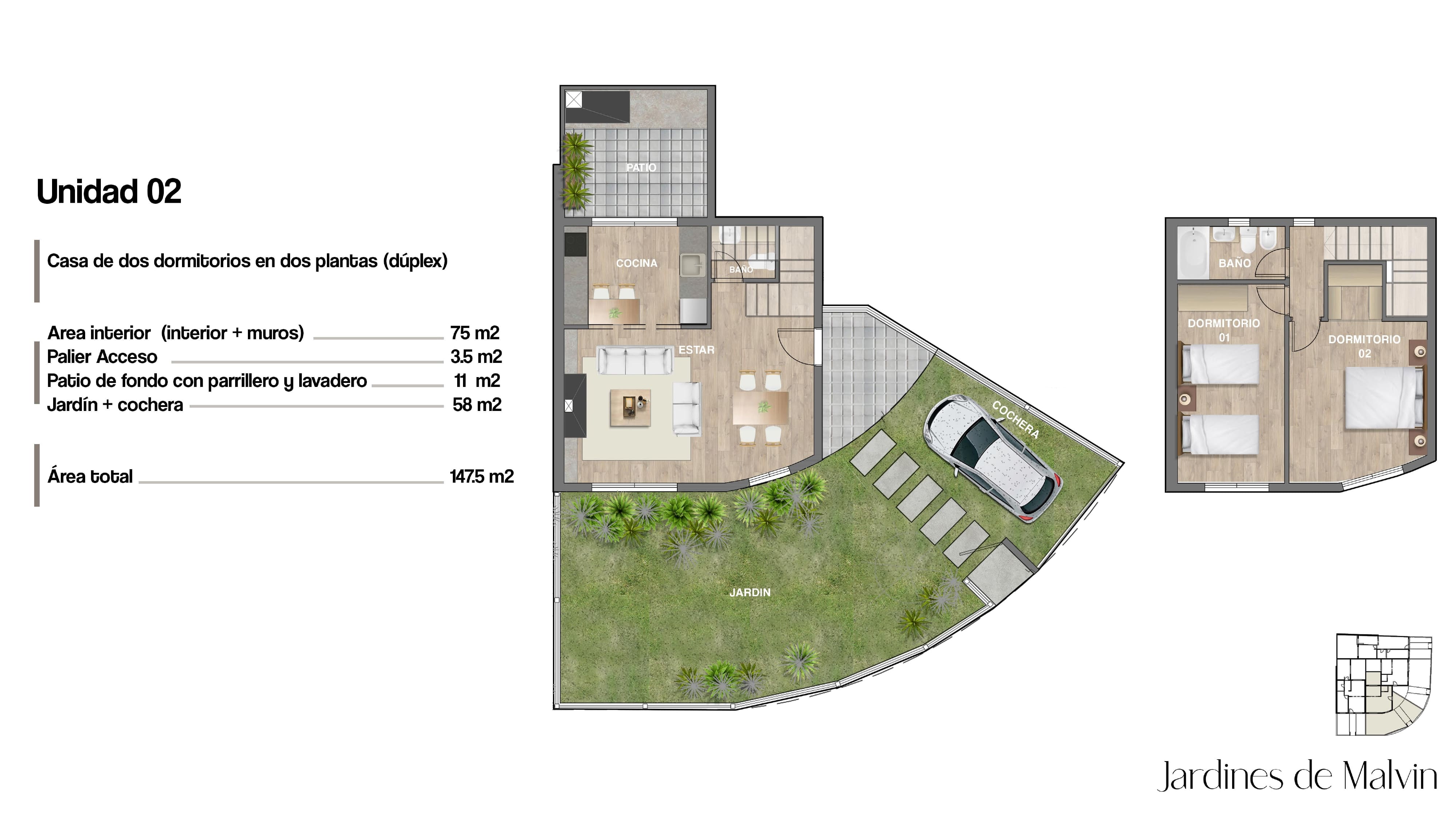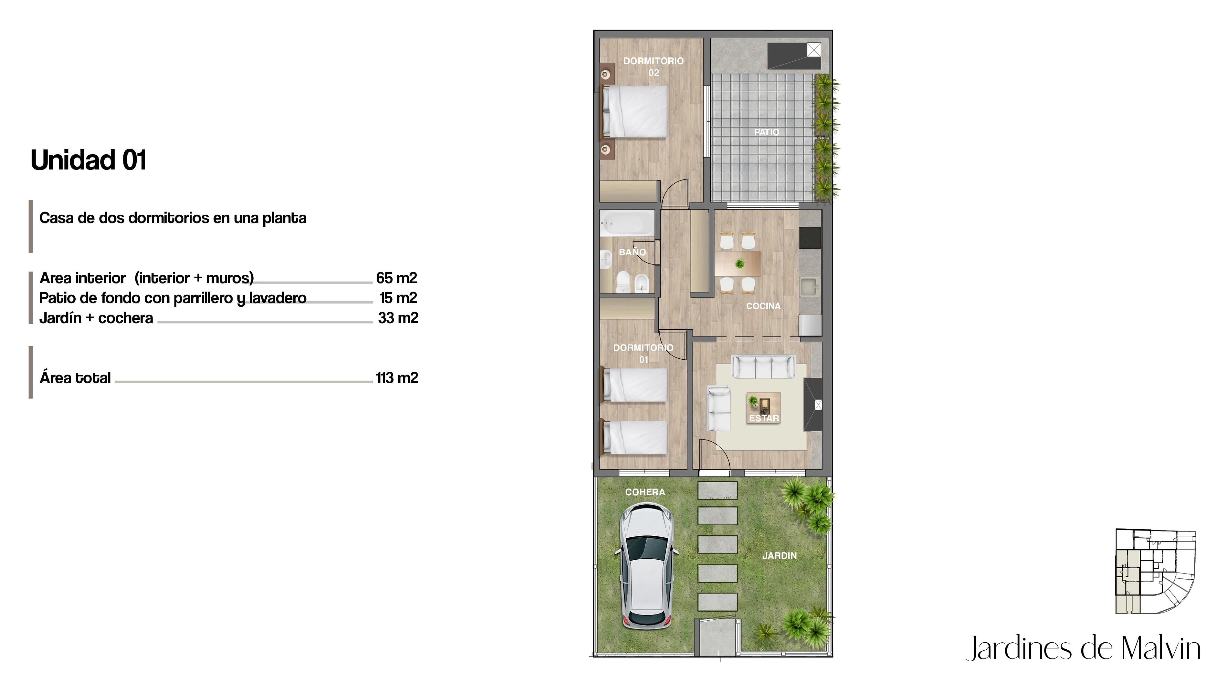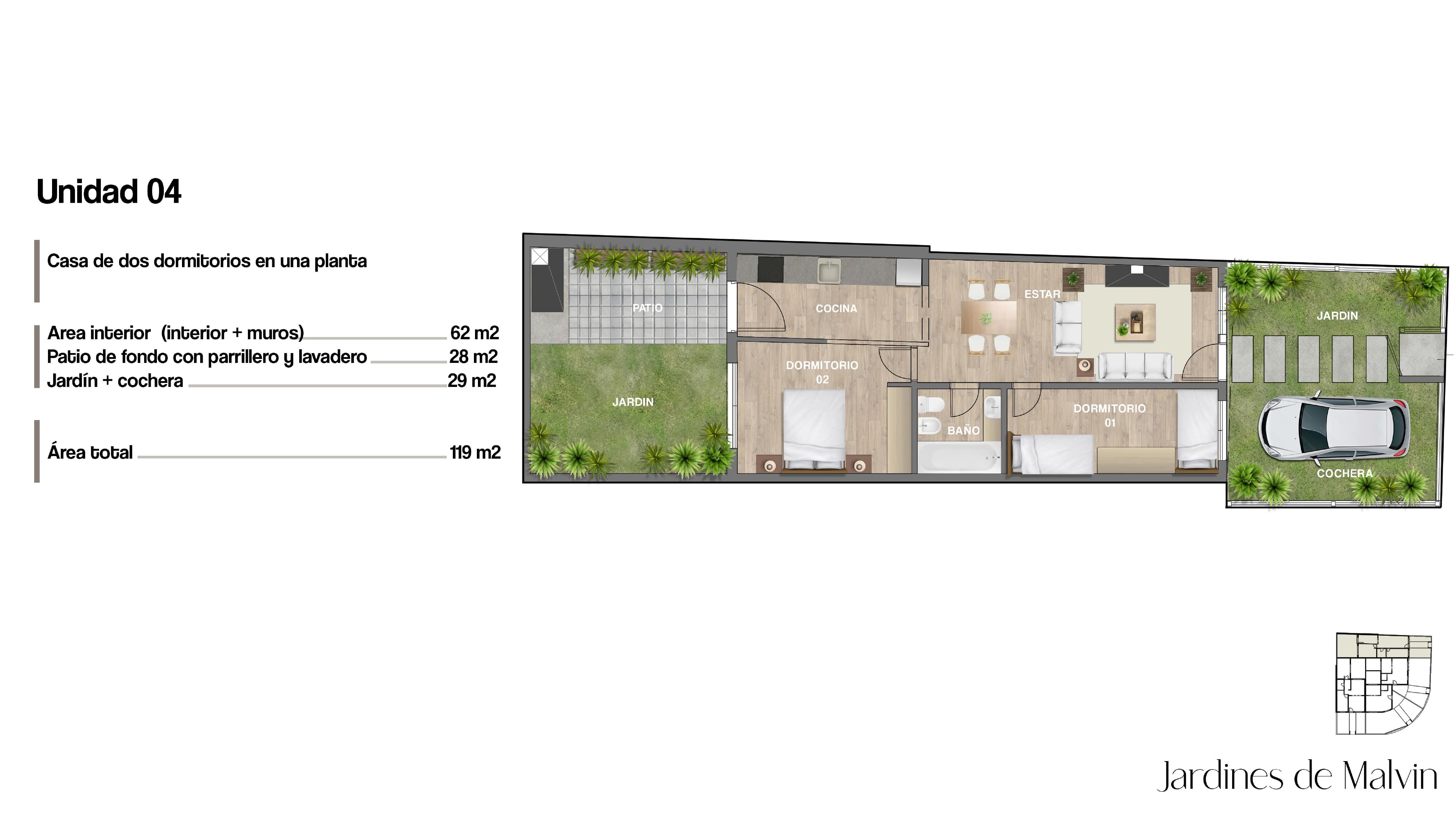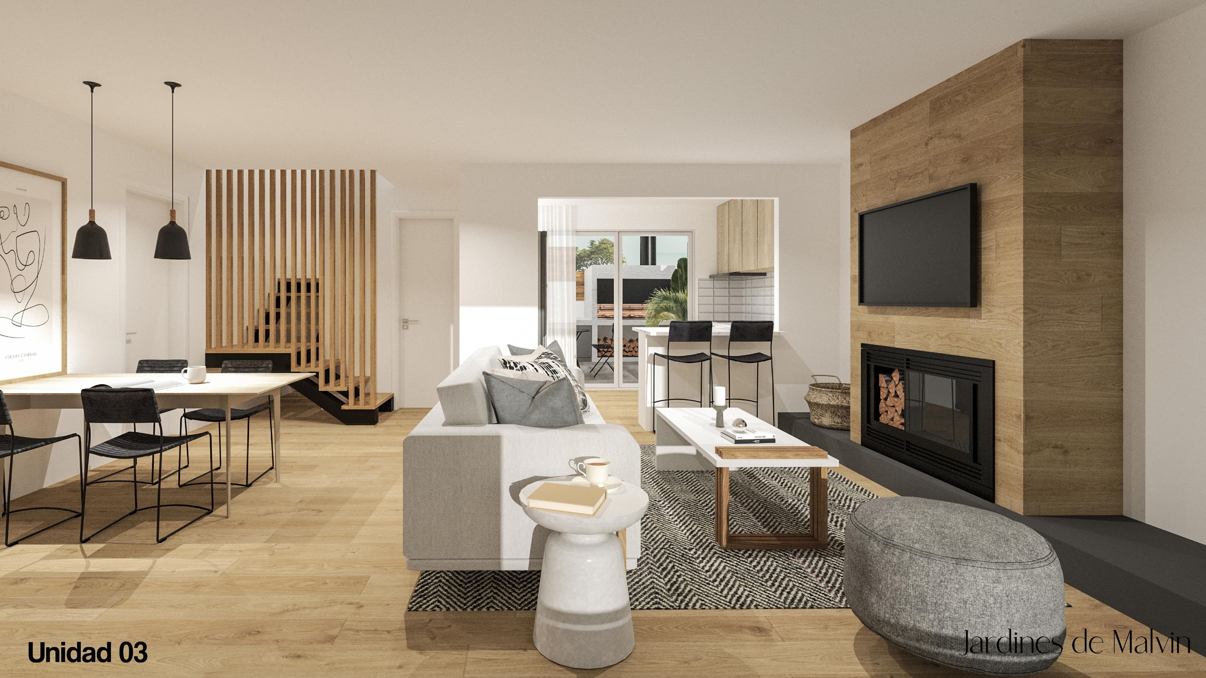 Jardines de Malvin es un complejo de viviendas en etapa de construcción Son 4 casas de dos dormitorios cada una, dos duplex y dos simples . Funcionan independientes y por tanto no tienen gastos comunes , con frente a la calle cochera y jardín verde exclusivo y fondo con parrillero exclusivo